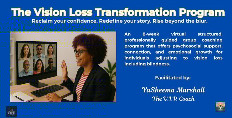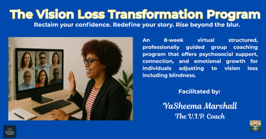 Our program serves the emotional and identity side of vision loss. I use coaching, not therapy, with a trauma-informed and strengths-based model